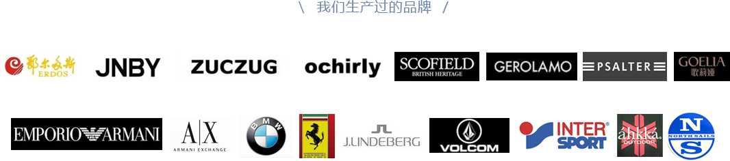 新元服裝擁有一支有著豐富經(jīng)驗(yàn)和忠于職守的專業(yè)團(tuán)隊(duì),以誠信為本,嚴(yán)謹(jǐn)務(wù)實(shí),重視質(zhì)量和交期,與國內(nèi)外的多家客戶建立了長期良好的合作關(guān)系,公司的服務(wù)的國內(nèi)外品牌包括: